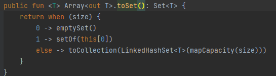 distinct는 toMutableSet호출후에 toList호출해서 List로 반환하는 반면 toSet은 추가 로직이 더 들어가 있네요.