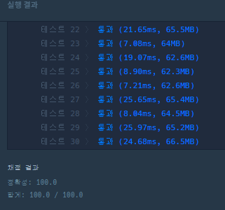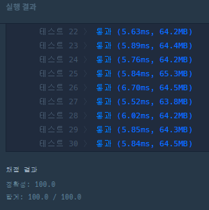 전체적으로 실행 시간이 줄었고 위에 보이진 않지만, 테스트 케이스 15번제외 모든 케이스가 실행시간이 10ms를 넘지않는다.