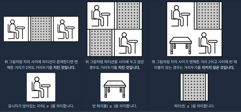 - 거리두기를 위하여 응시자들 끼리는 맨해튼 거리1가 2 이하로 앉지 말아 주세요.